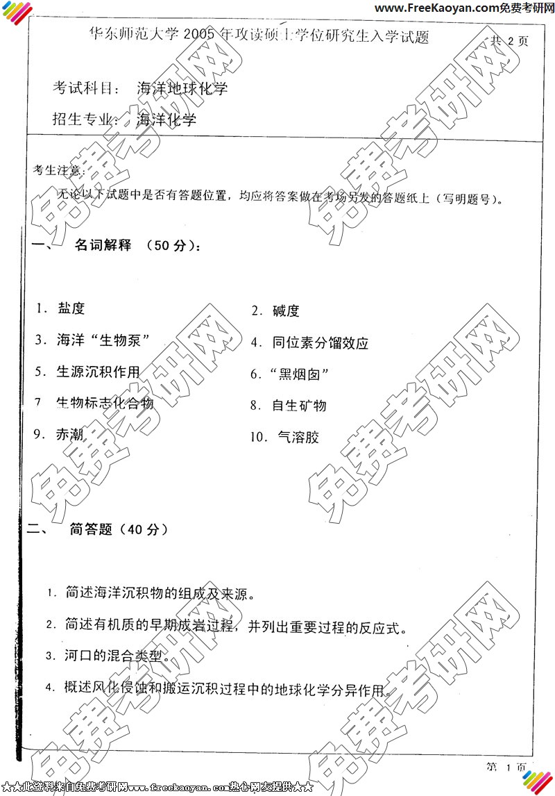 华东师范大学2005年半岛在线注册真题-海洋地球化学