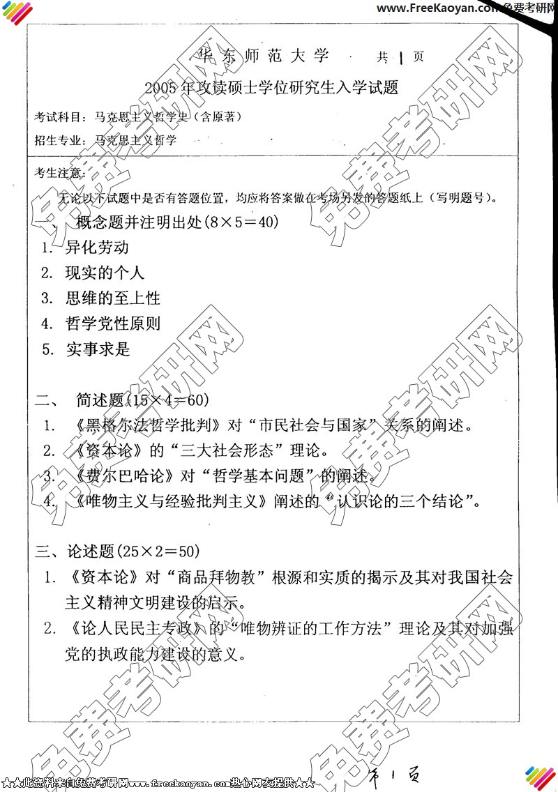 华东师范大学2005年半岛在线注册真题-马克思主义哲学史(含原著)