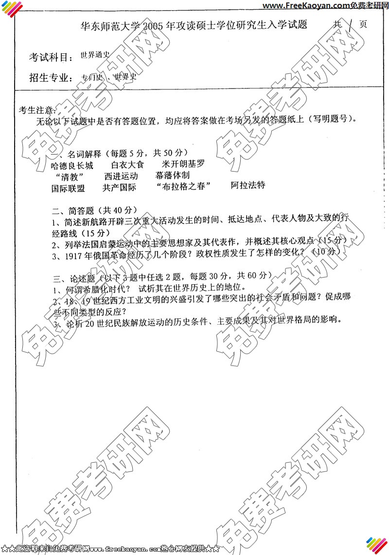专业课半岛在线注册经验 本站小编 FreeKaoyan 2018-01-22华东师范大学2005年半岛在线注册真题-世界近现代史(至1945年)