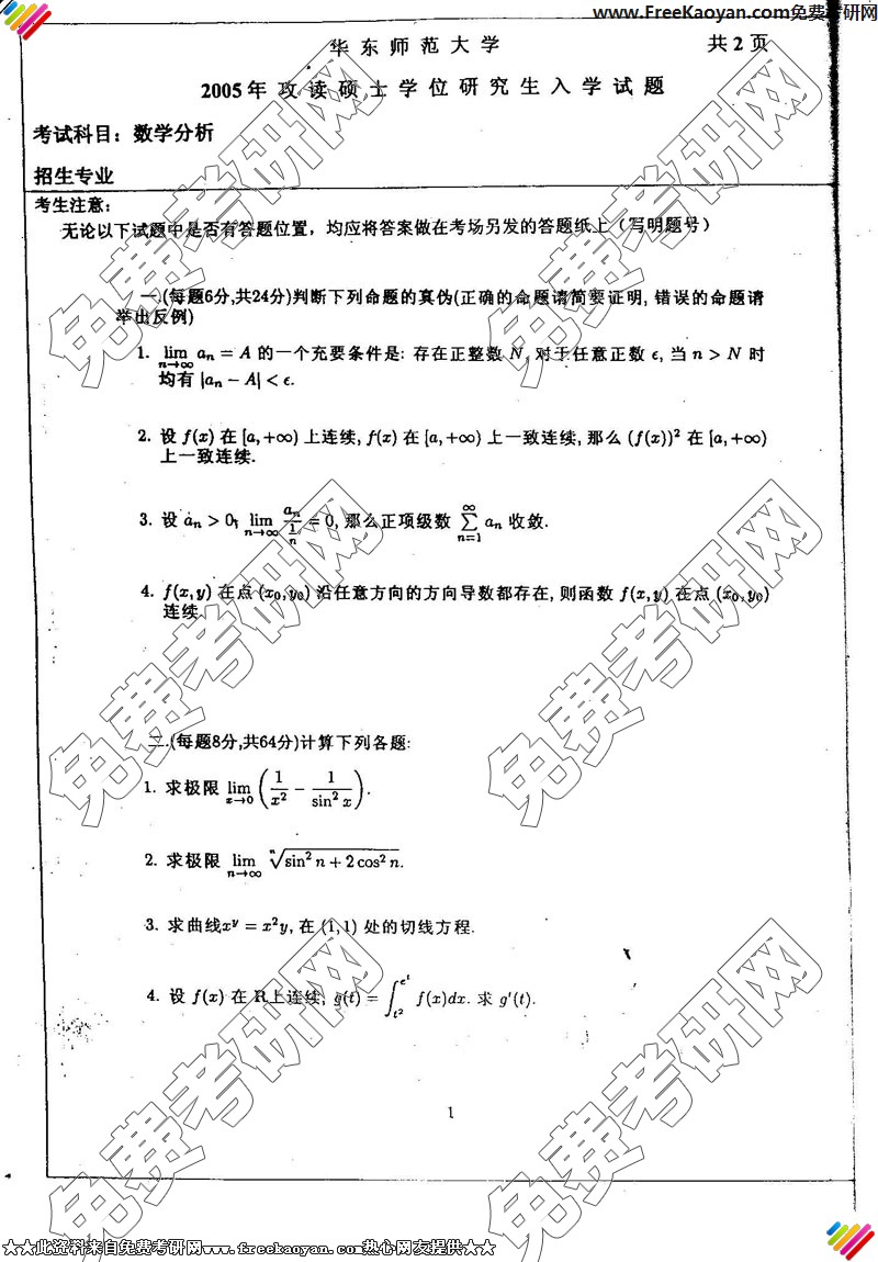 华东师范大学2005年半岛在线注册真题-数学分析