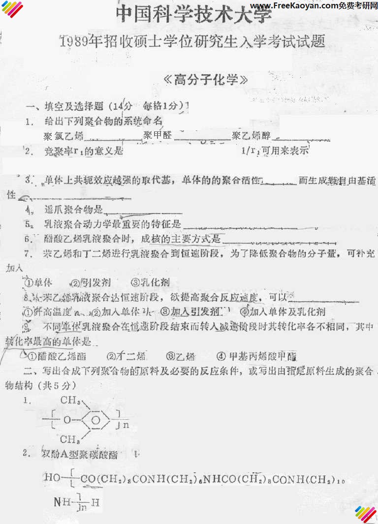 中国科学技术大学1989年半岛在线注册真题-高分子化学