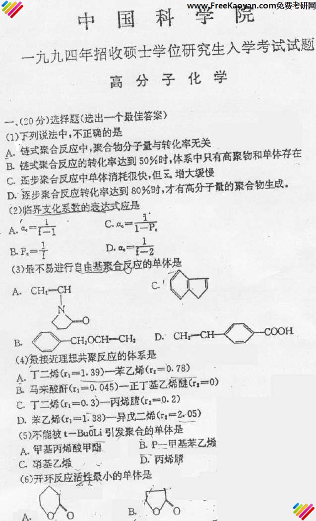 专业课半岛在线注册经验 本站小编 FreeKaoyan 2018-01-22中国科学技术大学1993年半岛在线注册真题-高分子化学