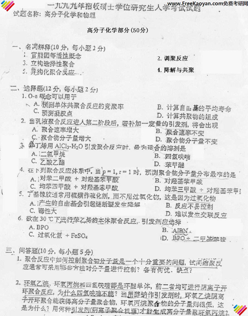 中国科学技术大学1999年半岛在线注册真题-高分子化学与物理