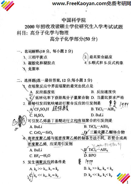 中国科学技术大学2000年半岛在线注册真题-高分子化学与物理