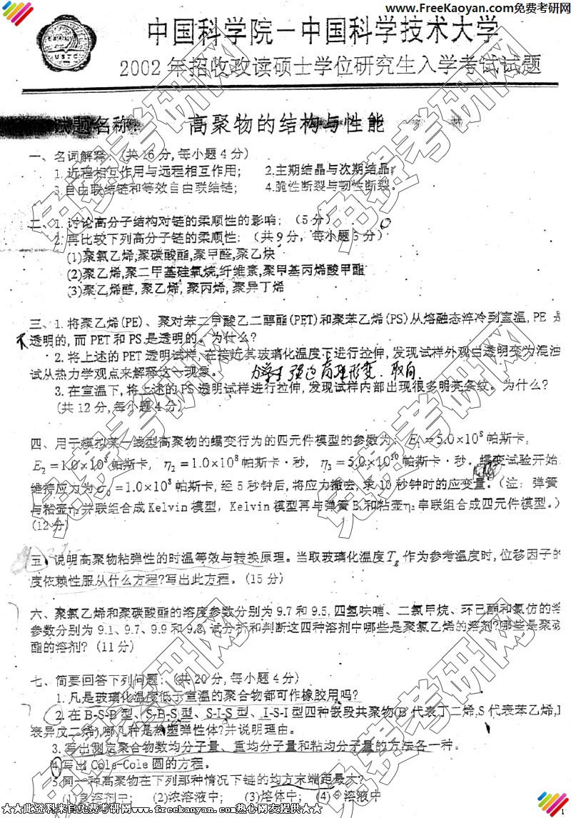 专业课半岛在线注册经验 本站小编 FreeKaoyan 2018-01-22中国科学技术大学2000年半岛在线注册真题-高分子化学与物理