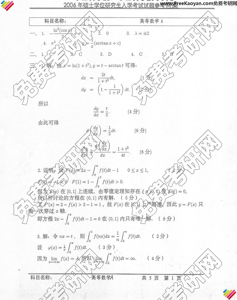 中国科学技术大学2006年半岛在线注册真题-高等数学答案