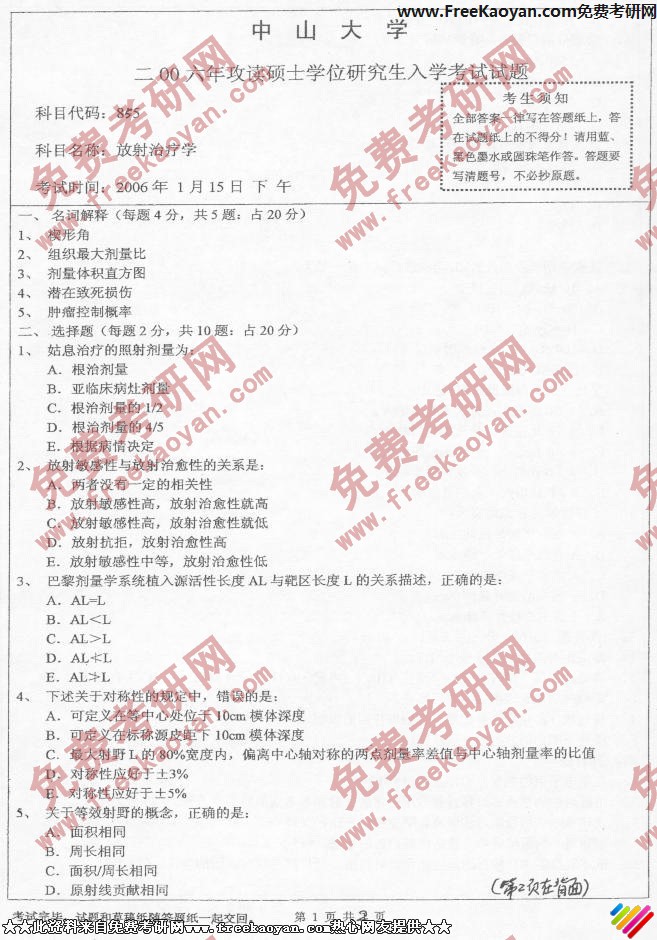 中山大学2006年半岛在线注册真题-放射治疗学