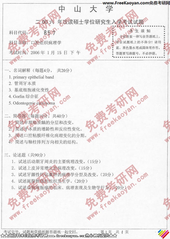 中山大学2006年半岛在线注册真题-口腔组织病理学