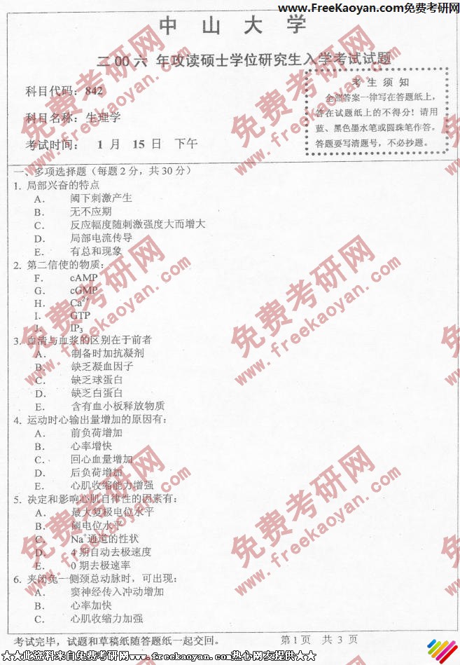 中山大学2006年半岛在线注册真题-生理学