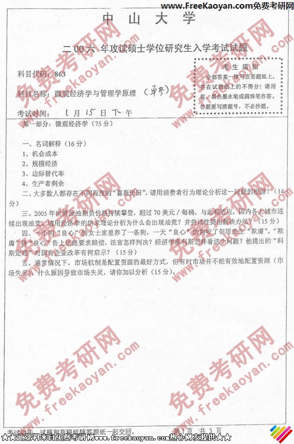中山大学2006年半岛在线注册真题-微观经济学与管理学原理(单考)