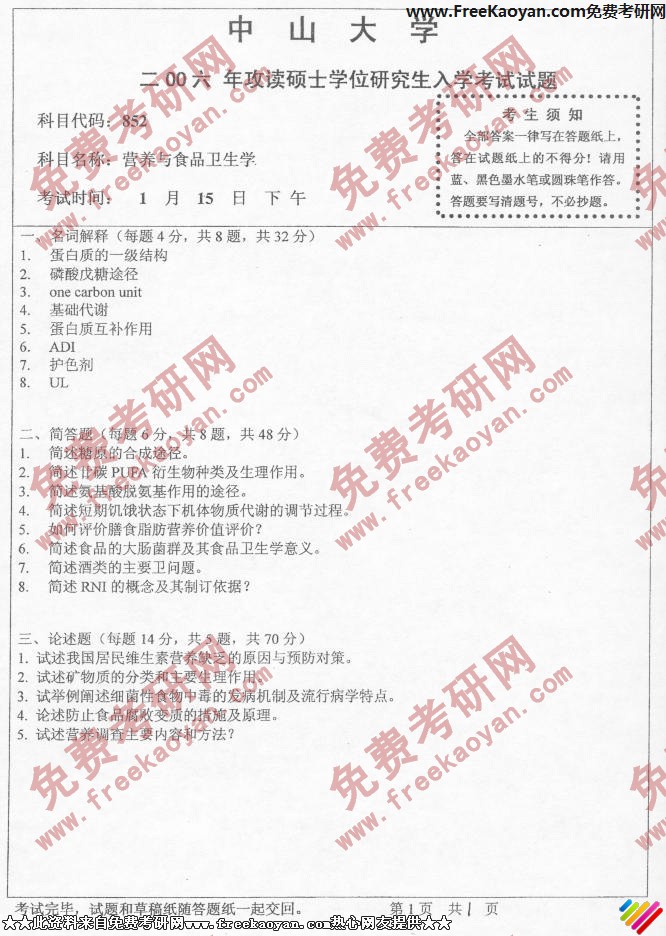 中山大学2006年半岛在线注册真题-营养与食品卫生学专业综合