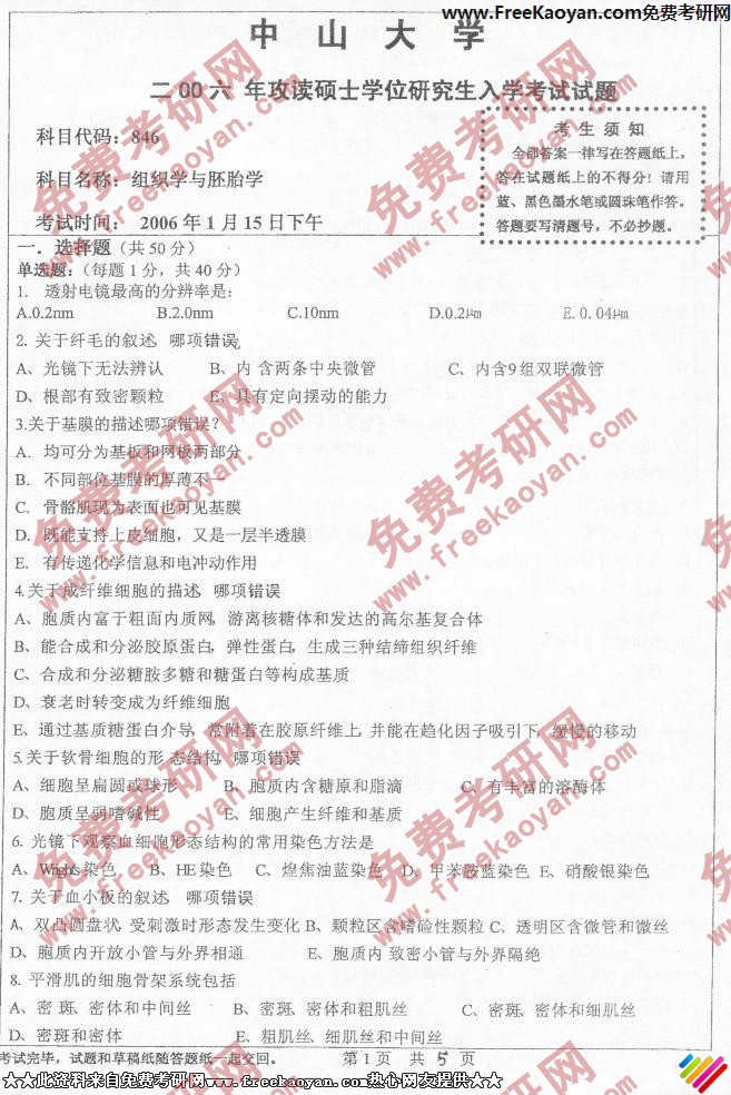 中山大学2006年半岛在线注册真题-组织学与胚胎学