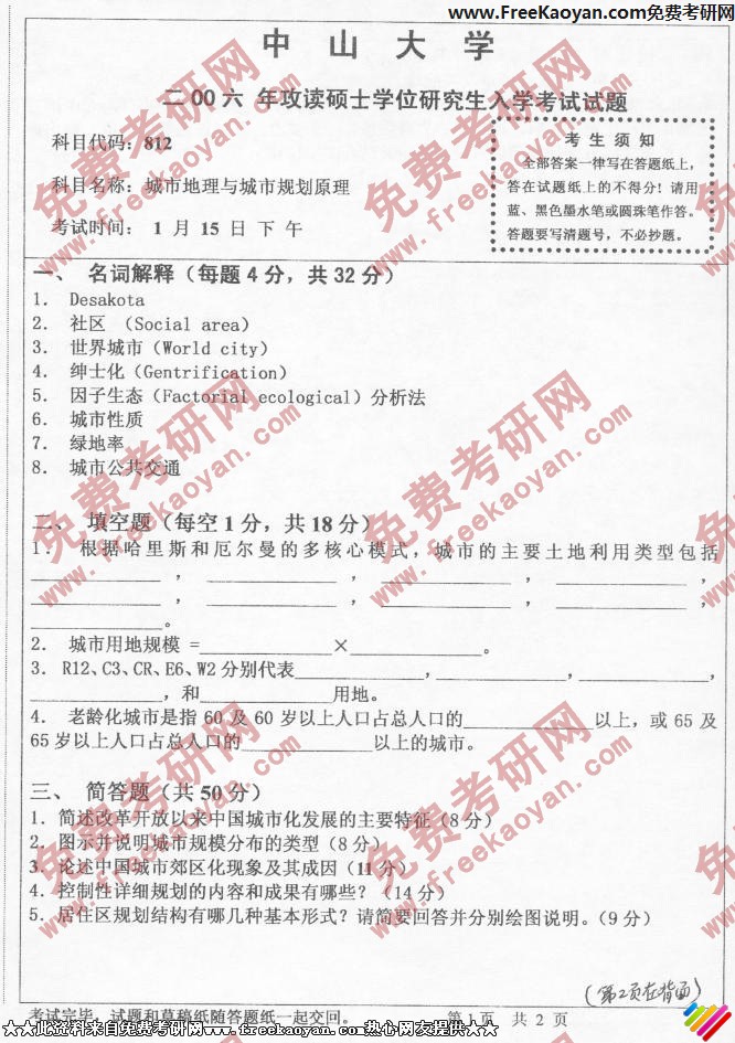 中山大学2006年半岛在线注册真题-城市地理与城市规划原理