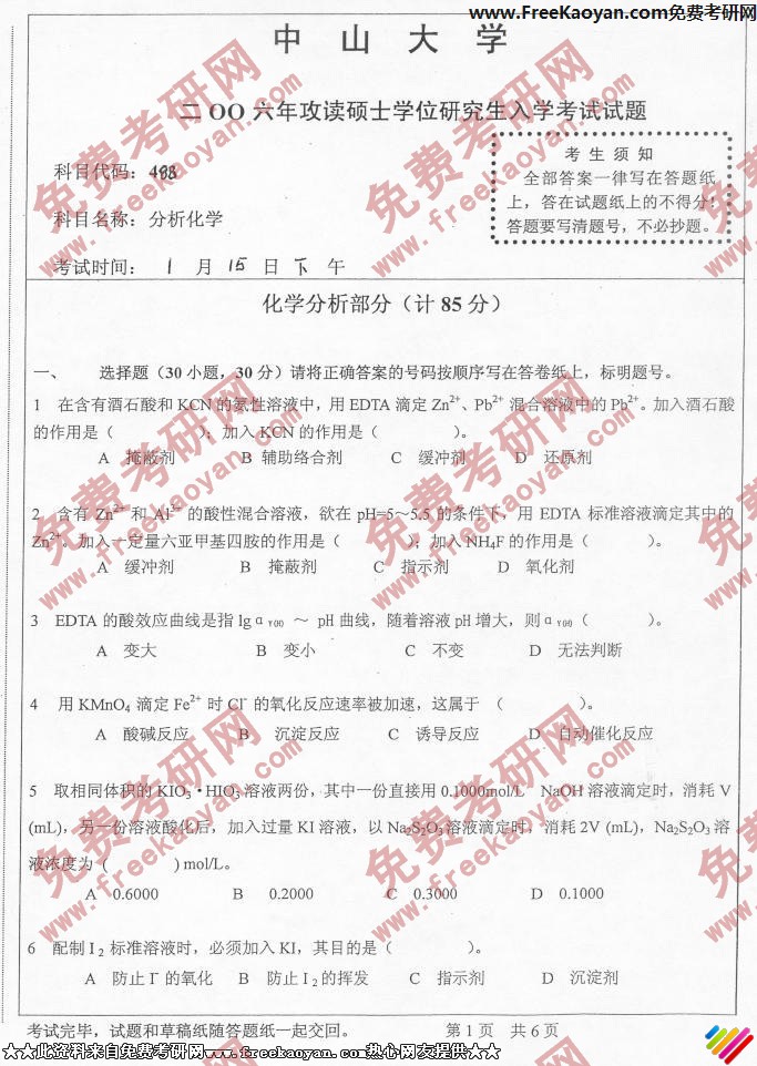 中山大学2006年半岛在线注册真题-分析化学
