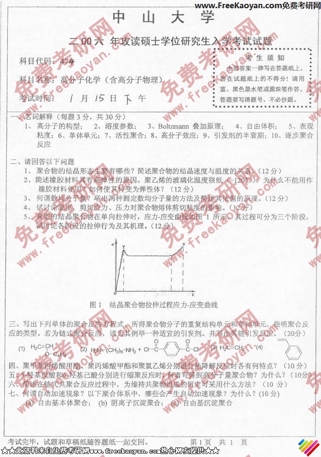 中山大学2006年半岛在线注册真题-高分子化学(含高分子物理)