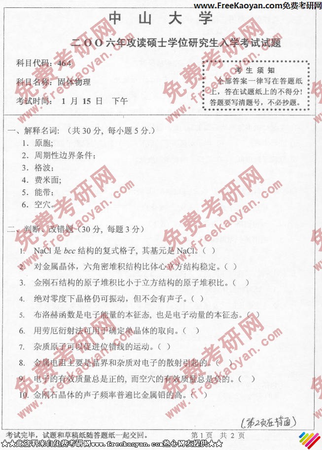 中山大学2006年半岛在线注册真题-固体物理