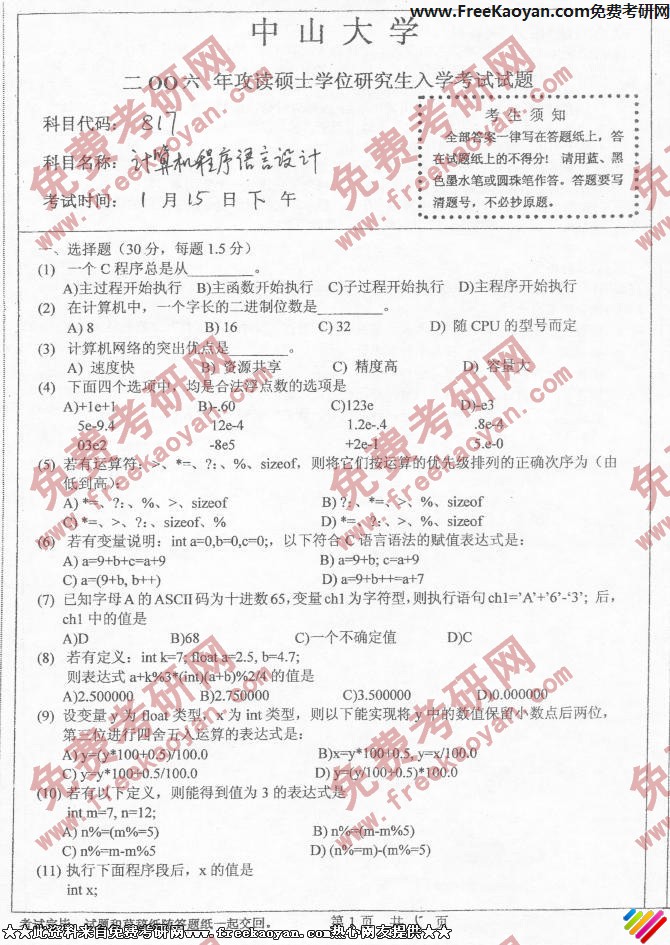 中山大学2006年半岛在线注册真题-计算机程序语言设计