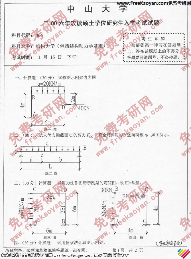 中山大学2006年半岛在线注册真题-结构力学(包括结构动力学基础)