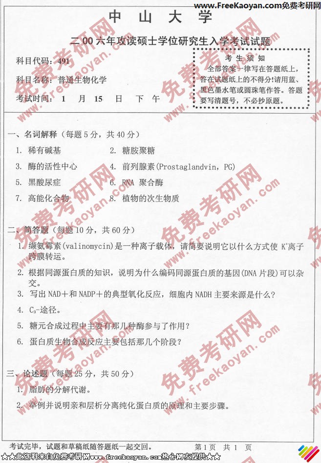中山大学2006年半岛在线注册真题-普通生物化学