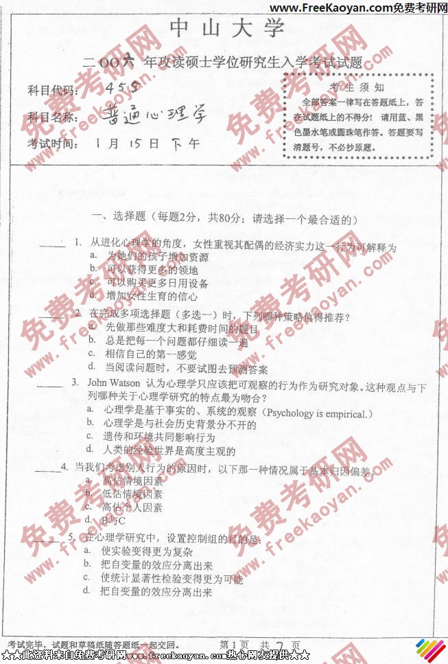 专业课半岛在线注册经验 本站小编 FreeKaoyan 2018-01-22中山大学2006年半岛在线注册真题-普通化学