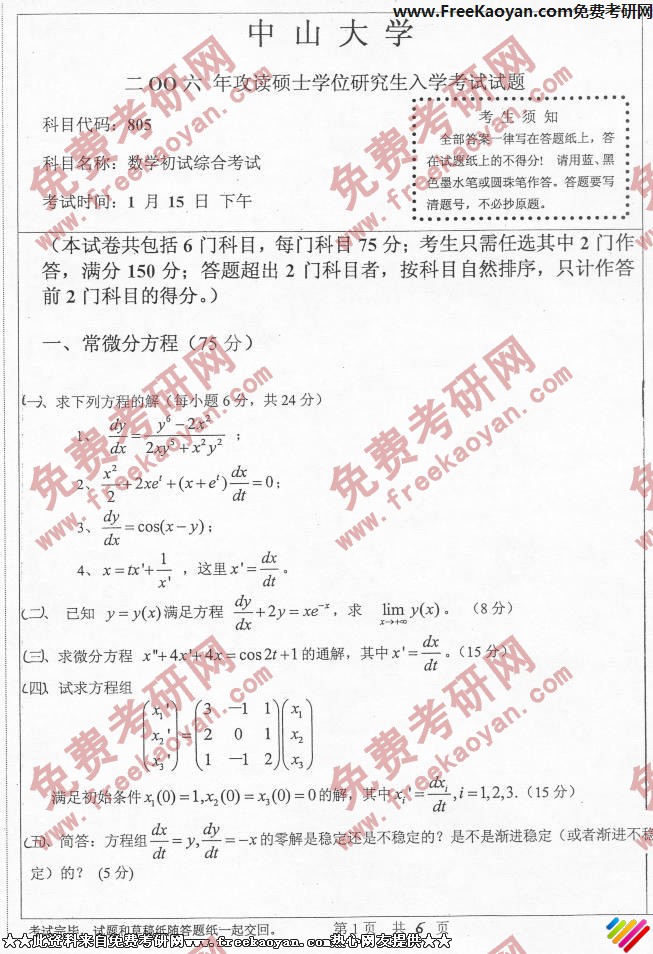 中山大学2006年半岛在线注册真题-数学初试综合考试(六门任选两门)