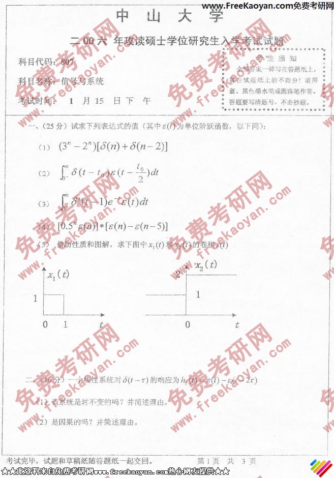 中山大学2006年半岛在线注册真题-信号与系统