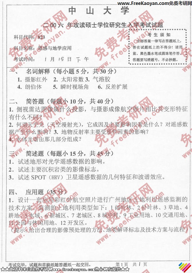 中山大学2006年半岛在线注册真题-遥感与地学应用
