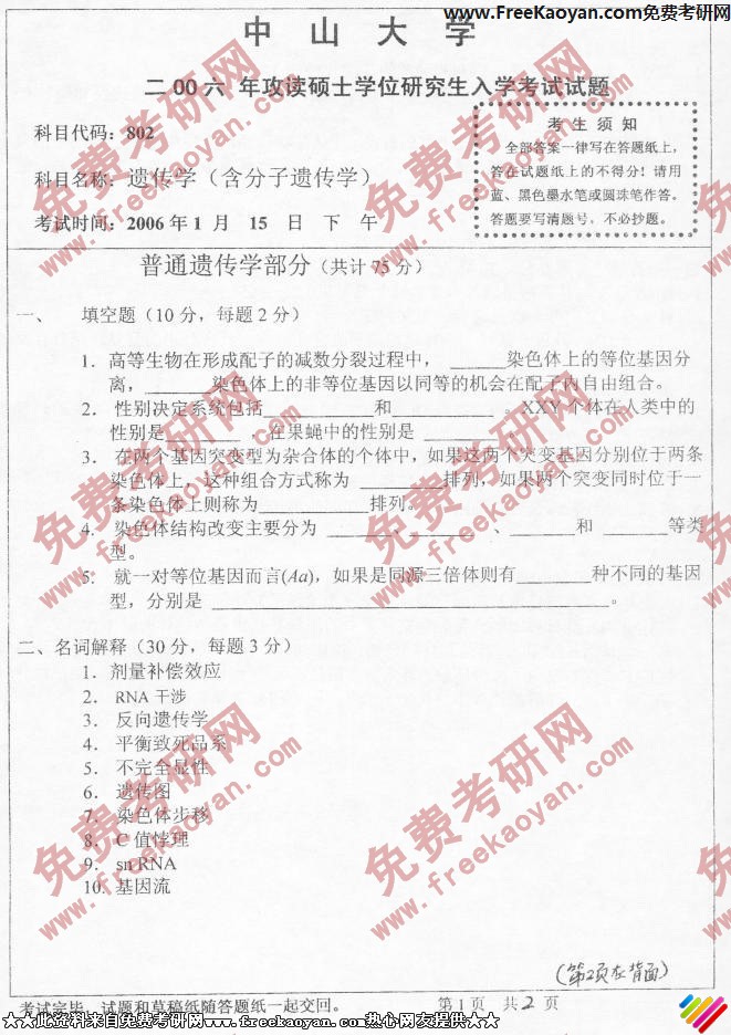中山大学2006年半岛在线注册真题-遗传学(含分子遗传学)