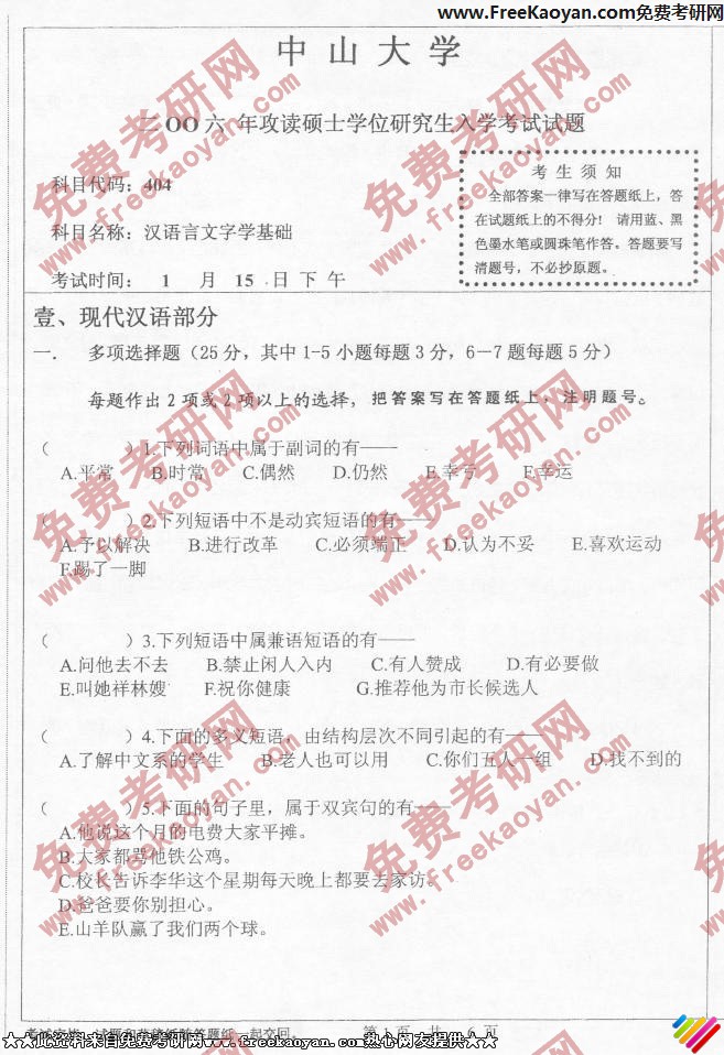 中山大学2006年半岛在线注册真题-汉语言文字学基础
