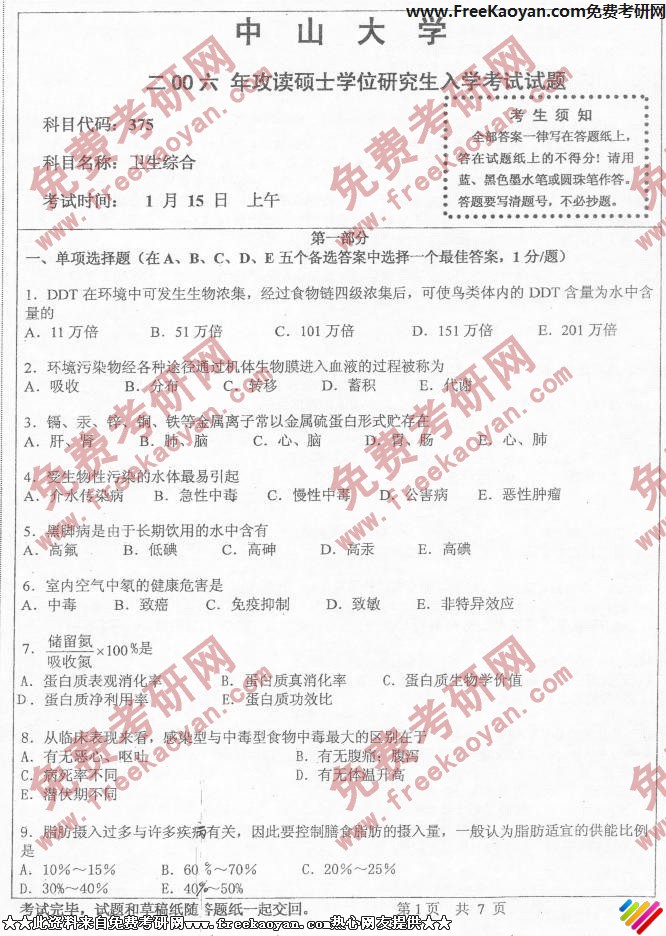 中山大学2006年半岛在线注册真题-卫生综合