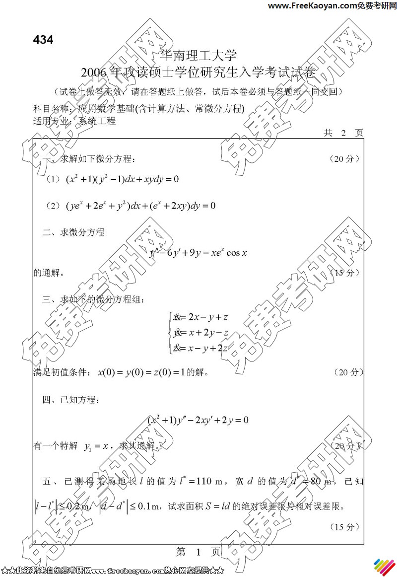 华南理工大学2006年半岛在线注册真题-应用数学基础(含计算方法、常微分方程)