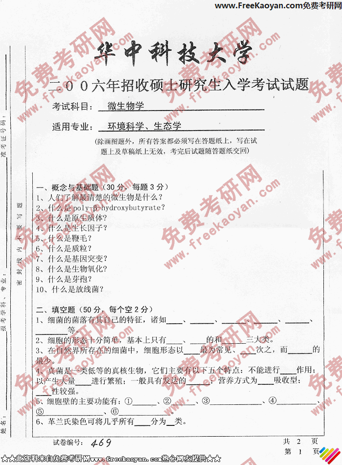 华中科技大学2006年半岛在线注册真题-微生物学469