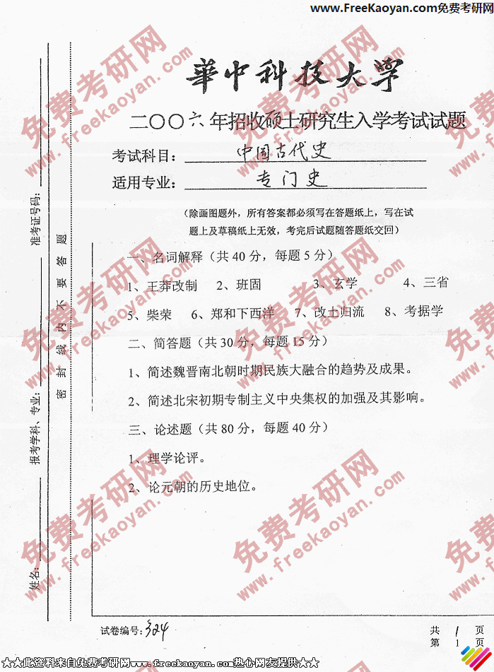 华中科技大学2006年半岛在线注册真题-中国古代史