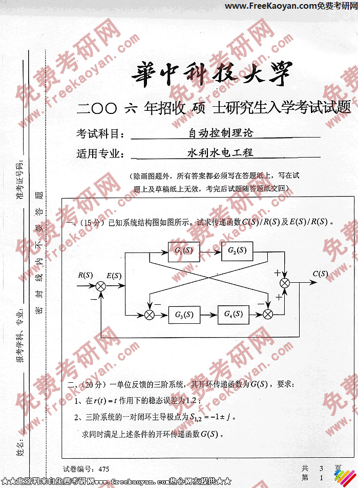 华中科技大学2006年半岛在线注册真题-自动控制理论475