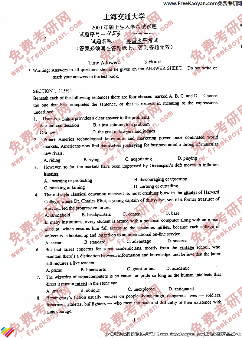 上海交通大学2003年半岛在线注册真题-英语水平考试