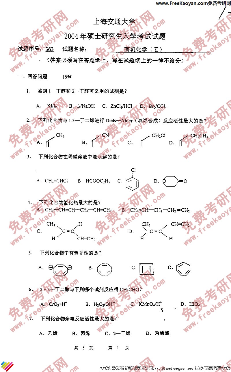 专业课半岛在线注册经验 本站小编 FreeKaoyan 2018-01-22上海交通大学2004年半岛在线注册真题-有机化学(1)