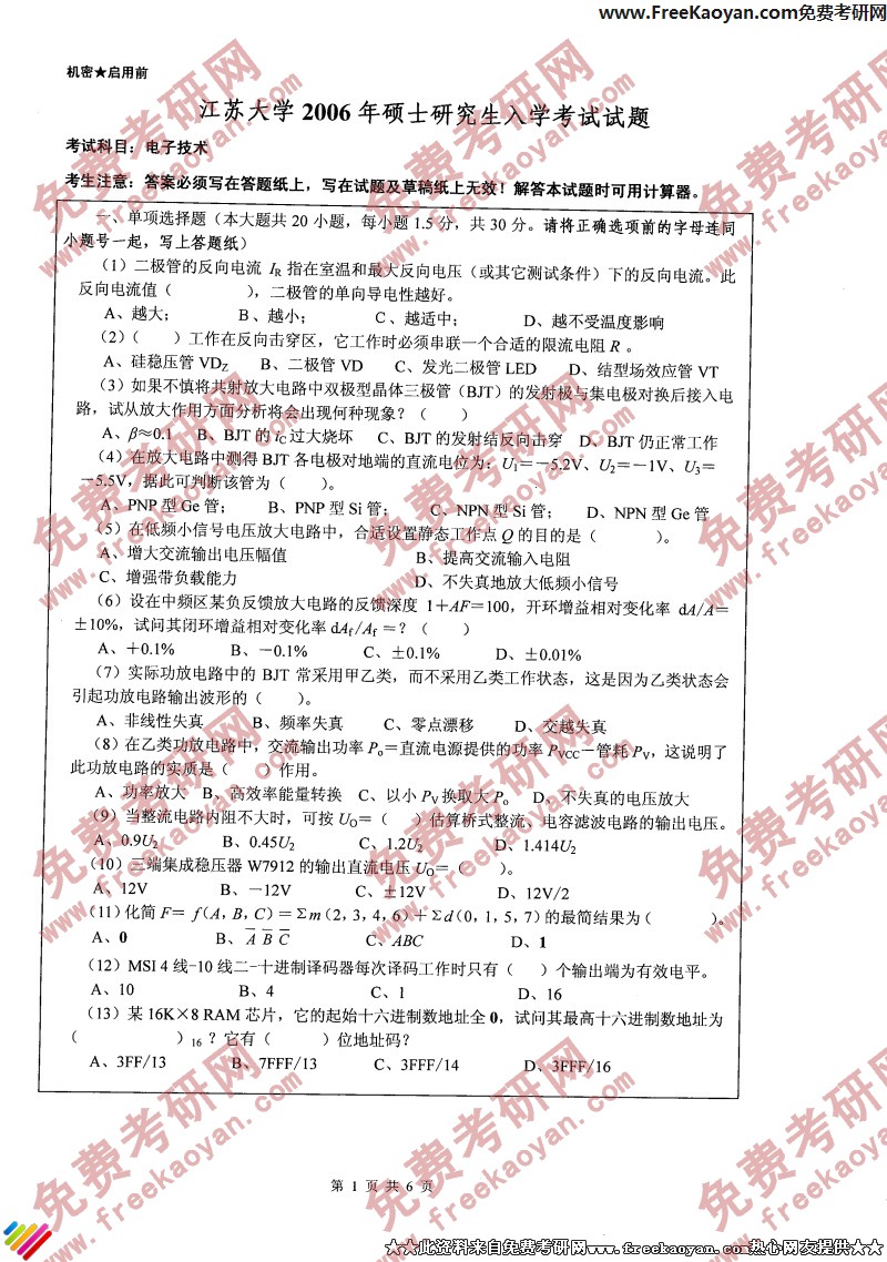 专业课半岛在线注册经验 本站小编 FreeKaoyan 2018-01-22江苏大学2006年半岛在线注册真题-电工电子学
