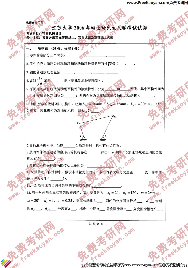 专业课半岛在线注册经验 本站小编 FreeKaoyan 2018-01-22江苏大学2006年半岛在线注册真题-机械原理