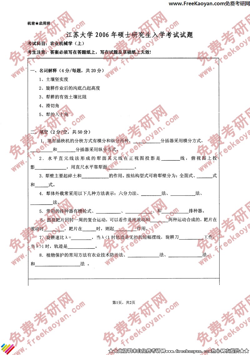 江苏大学2006年半岛在线注册真题-农业机械学(上)