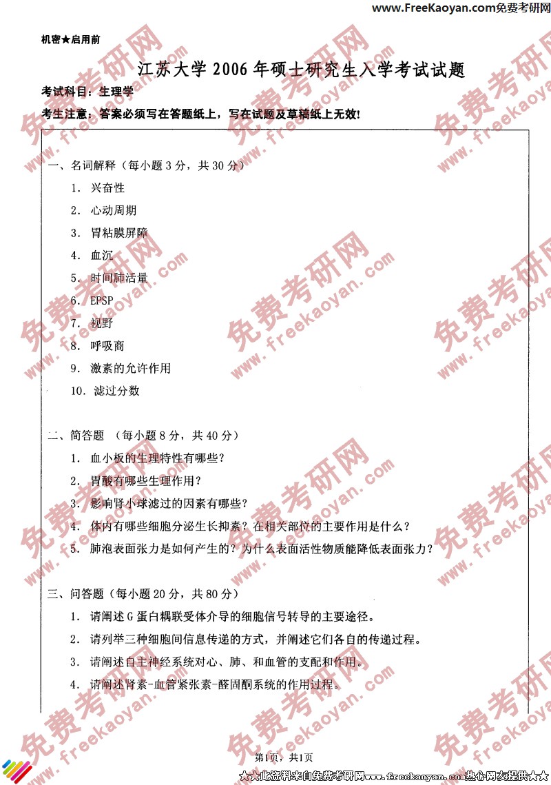 江苏大学2006年半岛在线注册真题-生理学