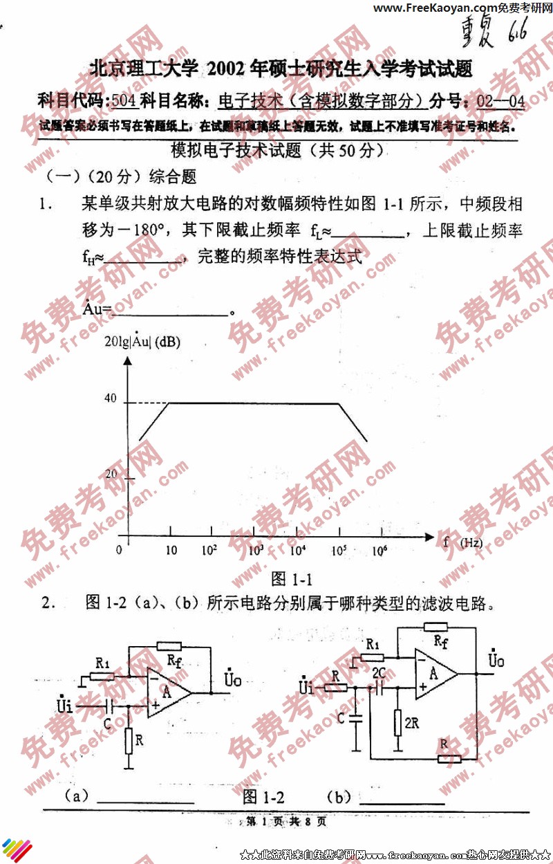 北京理工大学2002年半岛在线注册真题-电子技术(含模拟数字部分)