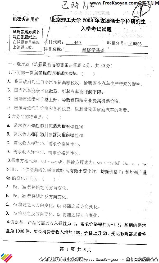 北京理工大学2003年半岛在线注册真题-经济学基础