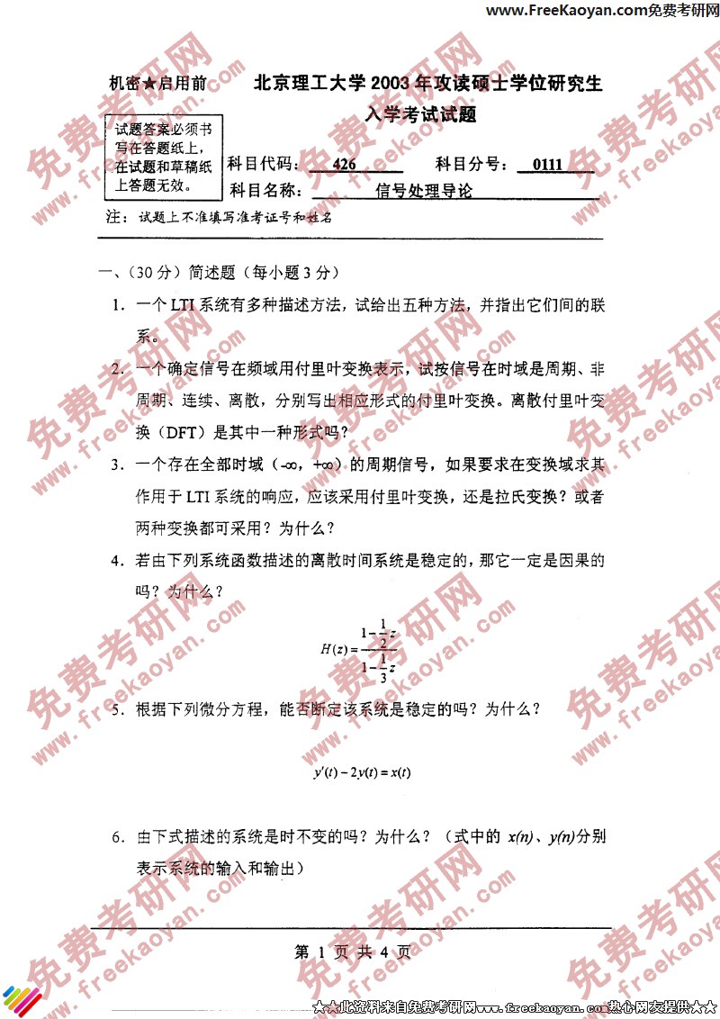 北京理工大学2003年半岛在线注册真题-信号处理导论