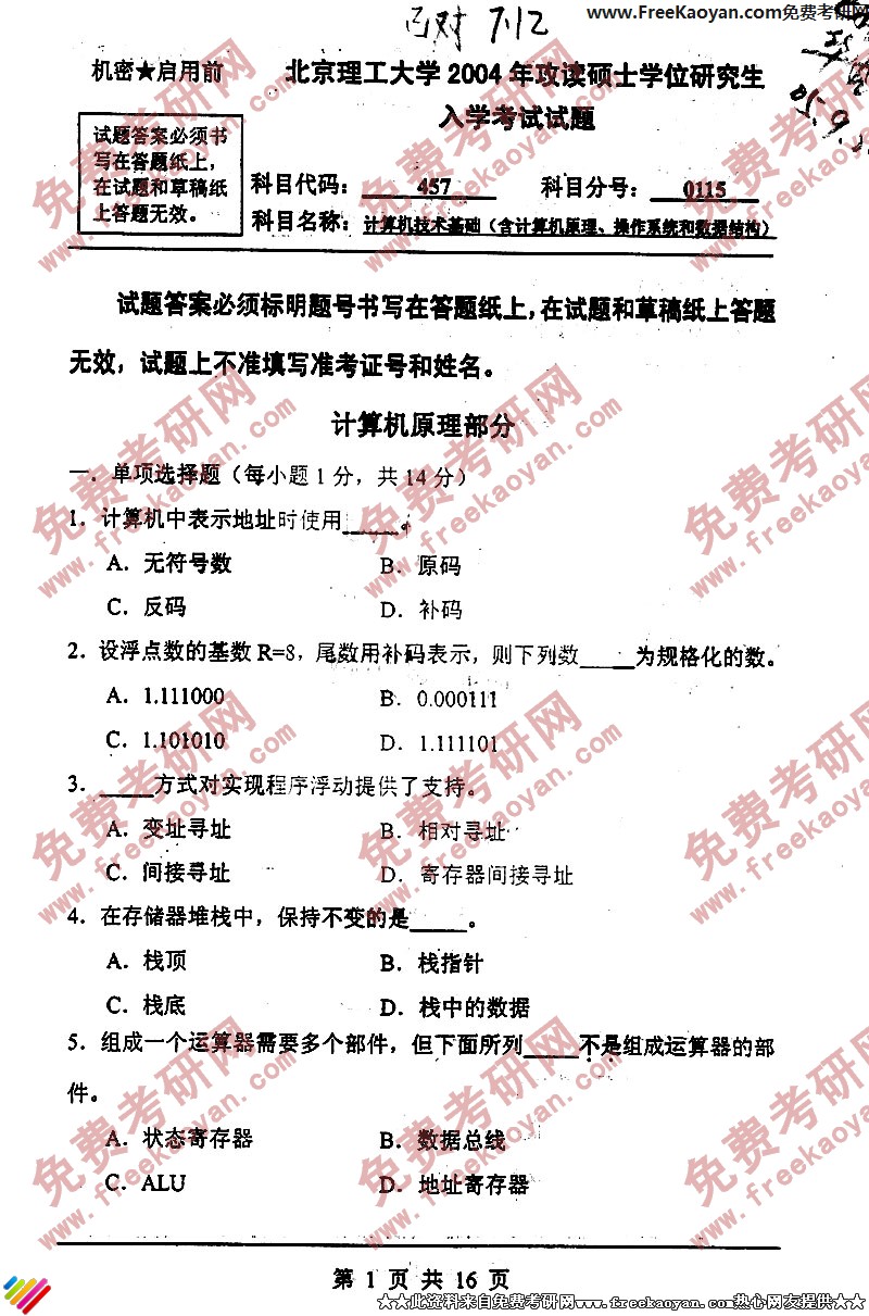 北京理工大学2004年半岛在线注册真题-计算机技术基础(含计算机组成原理、操作系统和数据结构)