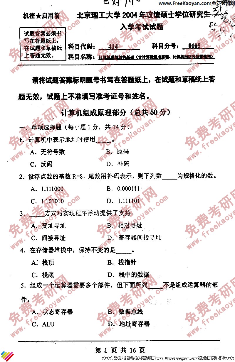 北京理工大学2004年半岛在线注册真题-计算机技术基础(含计算机组成原理、操作系统和数据结构)