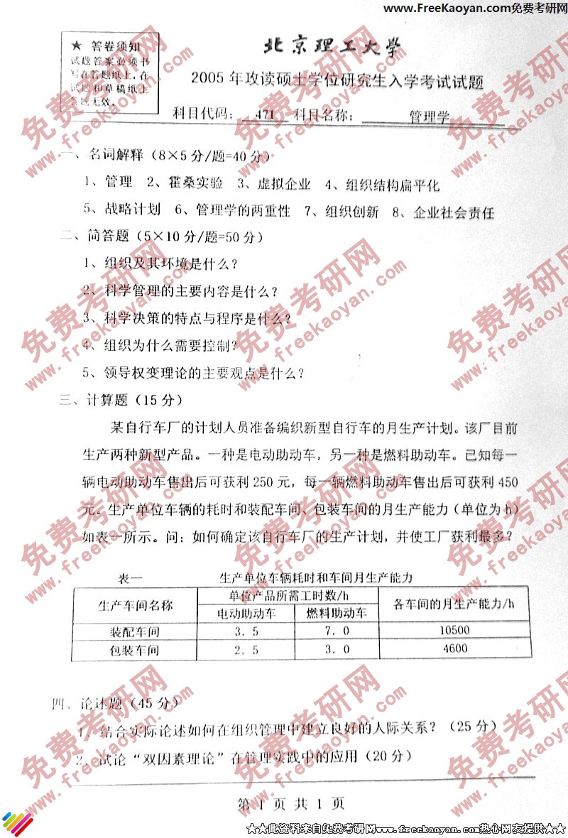 北京理工大学2005年半岛在线注册真题-管理学基础