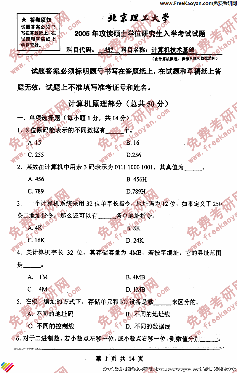 北京理工大学2005年半岛在线注册真题-计算机技术基础(含计算机组成原理、操作系统和数据结构)