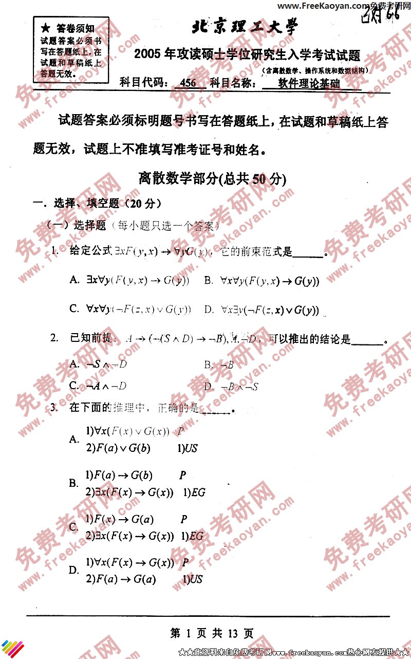 北京理工大学2005年半岛在线注册真题-软件理论基础