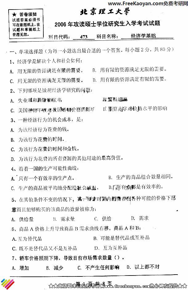 北京理工大学2006年半岛在线注册真题-经济学基础