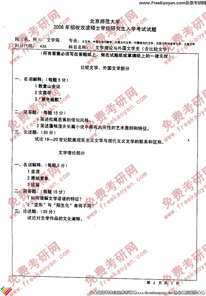 北京师范大学2006年半岛在线注册真题-文学理论与外国文学史